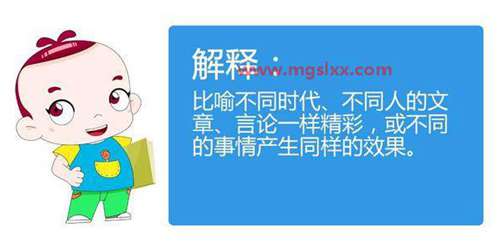 有同工的成语2020-06-27 03:08:23 阅读 17 次 评论 0 条摘要:本篇成语大全给大家提供的是有同工的成语,这篇内容中收录了较多的有同工的成语,部分成语有拼音和释义,有同工的成语都摘录于成语字典,希望这些有同工的成语能够帮助到您。异曲同工[yì qǔ tóng gōng] ,释义:也说同工异曲。曲调虽然不同,却都同样美妙。唐韩愈《进学解》:“子云、相如,同工异曲。” 后比喻不同的说法或做法都收到同样的效果。工:工巧。本文地址:https://www.suduxx.com/cyztym/cyztZVyVUMTH.html版权声明:本文收录于网络,如有侵权请E-mail联系 www.suduxx.com 站长! 点赞 1分享:PREVIOUS:有关于泼的成语NEXT:嘴和舌的成语大全文章导航