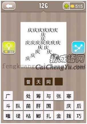 很多庆字,组成一个天字的答案是什么成语2020-11-18 20:28:19 阅读 140 次 评论 0 条摘要:很多庆字,组成一个天字,猜一个成语答案是什么? 答案:普天同庆 【释义】普:普遍;天:天下;庆:庆... 很多庆字,组成一个天字,猜一个成语答案是什么? 答案:普天同庆 【释义】普:普遍;天:天下;庆:庆贺。普天下共同庆祝。天下的人或全国的人共同庆祝。【近义】额手称庆拍手称快【反义】哀鸿遍野怨声载道【示例】大街上搭起几坐彩坊,中间还有四个字道:“普天同庆”,据说这算是过年。本文地址:https://www.suduxx.com/ktccy/MY163jh.html版权声明:本文收录于网络,如有侵权请E-mail联系 www.suduxx.com 站长! 点赞 1分享:PREVIOUS:一只鱼,一双眼睛,一个人头晕,一只猪的答案是什么成语NEXT:很多兵字,组成两个字,草,木的答案是什么成语文章导航