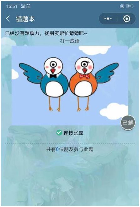 全民有文化猜成语中,有个图片中是两只小鸟,两只鸟并在一起飞,每只小鸟只有一只翅膀,是什么成语?图片是这个样子的:
