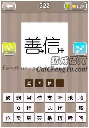 一个善字,一个信字的答案是什么成语2020-11-18 20:13:29 阅读 38 次 评论 0 条摘要:一个善字,一个信字,猜一个成语答案是什么? 答案:善男信女 看到善字底下的那个口字有着代表男士的标... 一个善字,一个信字,猜一个成语答案是什么? 答案:善男信女 看到善字底下的那个口字有着代表男士的标志,信字下的口有着代表女士的标志,就想到成语善男信女。佛教术语。泛指信仰宗教、皈依道门、遵守斋戒律条,倾心道法教理,不负法师教诲的善男子、善女人。善指善信,信指崇信。本文地址:https://www.suduxx.com/ktccy/MYNkipl.html版权声明:本文收录于网络,如有侵权请E-mail联系 www.suduxx.com 站长! 点赞 1分享:PREVIOUS:一个门字,一个户字的答案是什么成语NEXT:两边水龙头开着水的答案是什么成语文章导航