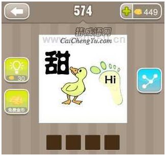 看图猜成语、成语玩命猜、看图猜成语甜字和一只鸭子、HI、脚丫答案是什么?这里就为大家公布这个成语的答案,首先为大家解析这个图片中成语需要如何释义: 看图猜成语图片寓意一般为3个方面:第一种图片中的文字就是包含了答案的近义或者谐音;第二种图片形容的内容就是答案;第三种图片和文字组合成的答案。