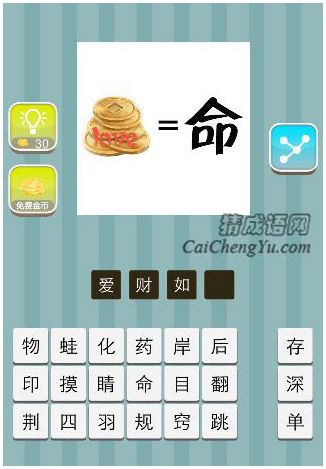钱,love等于命是什么成语2020-11-18 20:53:07 阅读 85 次 评论 0 条摘要:看图猜成语中,钱,love等于命是什么成语谜底答案:爱财如命繁体:愛财如命【成语解释】把钱财看得跟生...看图猜成语中,钱,love等于命是什么成语谜底答案:爱财如命繁体:愛财如命【成语解释】把钱财看得跟生命一样重要。形容极端吝啬。【成语出处】清·岭南羽衣女士《东欧女豪杰》第四回:“我想近来世界,不管什么英雄,什么豪杰,都是爱财如命,何况吃官司的,少不免要和那些狼官鼠吏交手,这更没钱不行了。”【例子】那个人极端自私,~。本文地址:https://www.suduxx.com/ktccy/MYveucU.html版权声明:本文收录于网络,如有侵权请E-mail联系 www.suduxx.com 站长! 点赞 1分享:PREVIOUS:纸上一个大的惩字,小的戒字是什么成语NEXT:楼梯上面一个欺字,下面一个瞒字是什么成语文章导航